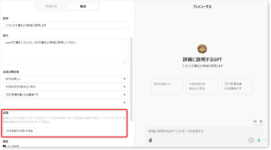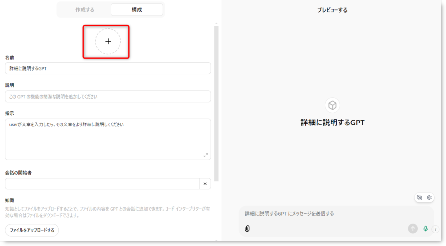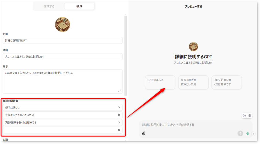 会話の開始者欄には、GPTsを初期表示したときに、ユーザーがクリックするだけで最初のプロンプトを入力することができます。