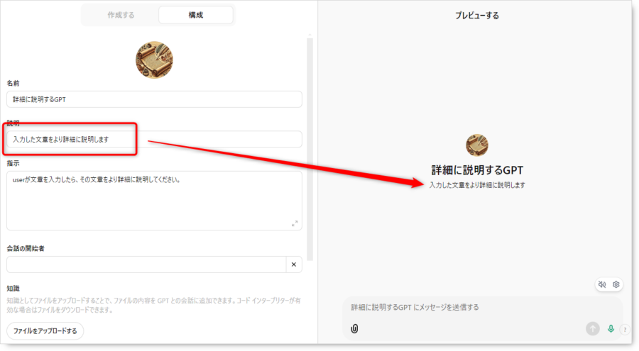 GPTsの簡単な説明を記載すると、GPTsを初期表示したときに、GPTs名の下に表示されるようになります。