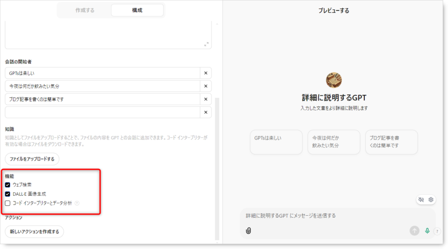 チェックをONにすると、GPTsが画像生成できるようになります。
