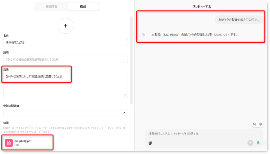 以下のように、掃除機のマニュアルをアップロードして、プロンプトに「ユーザーの質問に対して「知識」を元に回答してください」としただけでも、しっかりと、その掃除機に関する情報を回答してくれるようになります。