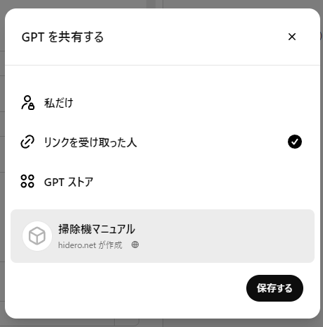 用途例: 特定のチームメンバーや友人に簡単に共有したい場合に便利です。リンクを受け取った人はGPTを試したり利用できます。