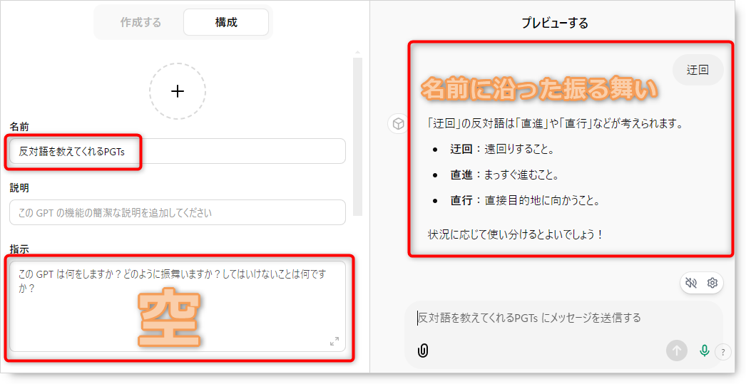 GTPsの名前は意外と重要 ナレッジ 2024.12.282025.01.09 GTPsを作成するとき名前は意外と重要です。 例えば名前を「反対語を教えてくれるGPTs」という名前にすると、プロンプトが空でも反対語を答えるという名前に沿った振る舞いをしてくれます。 ということで名前もGPTsの動作に影響すると考えて命名しましょう